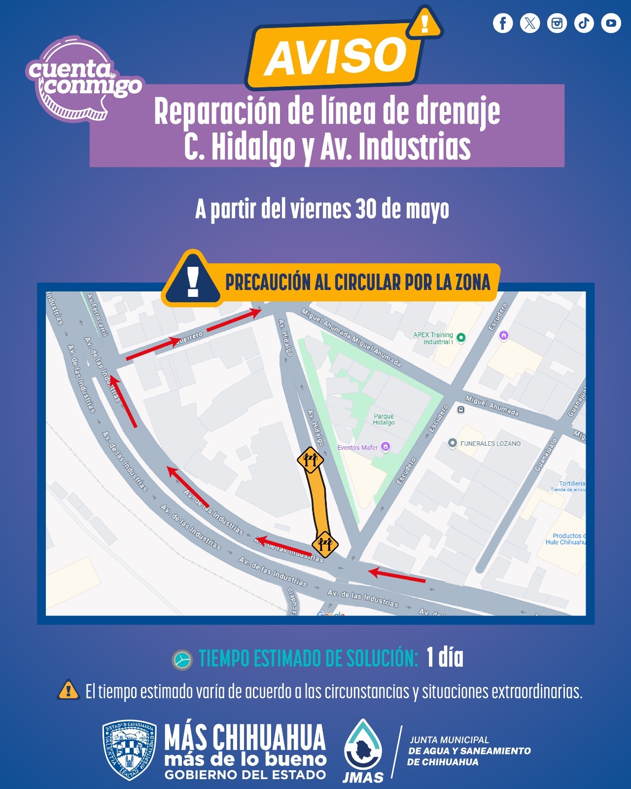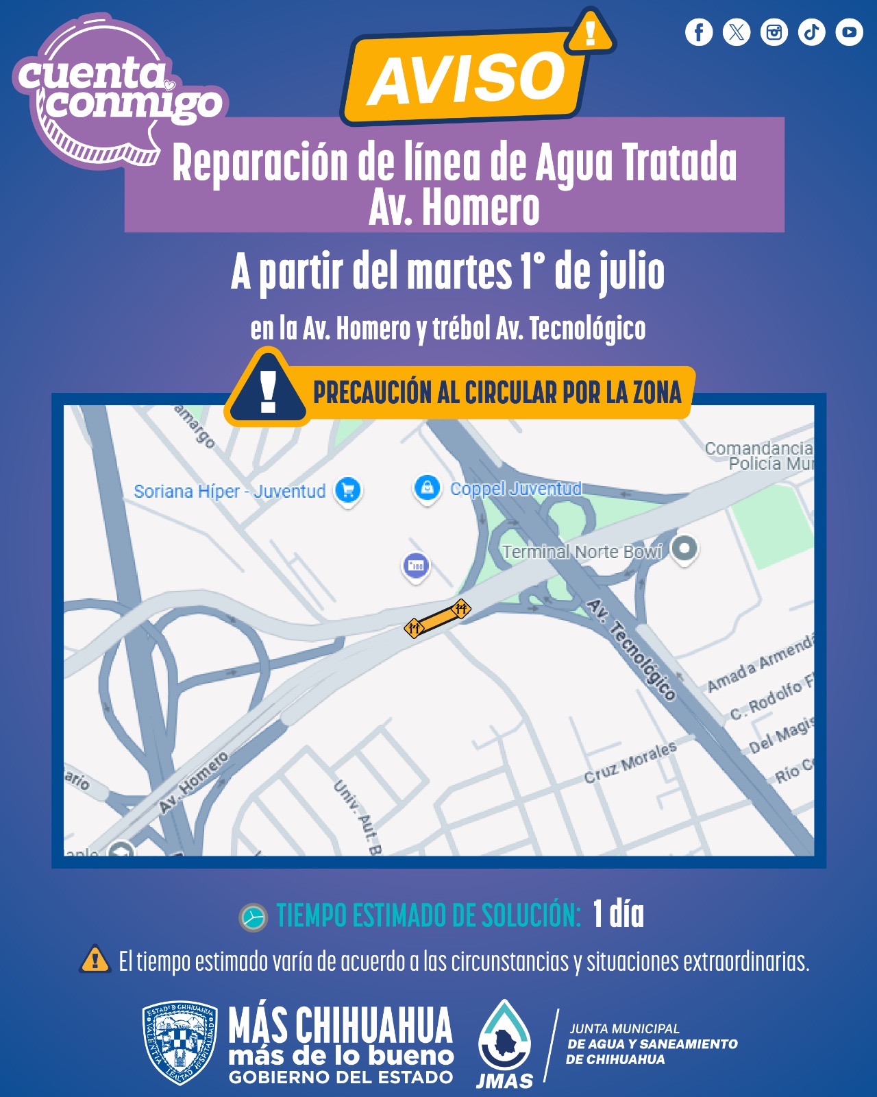 La Junta Municipal de Agua y Saneamiento (JMAS) de Chihuahua, informó que este martes 1 de julio realizará reparaciones sobre un tramo de tubería de que se encuentra en la calle Homero, antes de llegar a la avenida Tecnológico. Las maniobras incluyen la restauración de un tubo de 8 pulgadas [...]