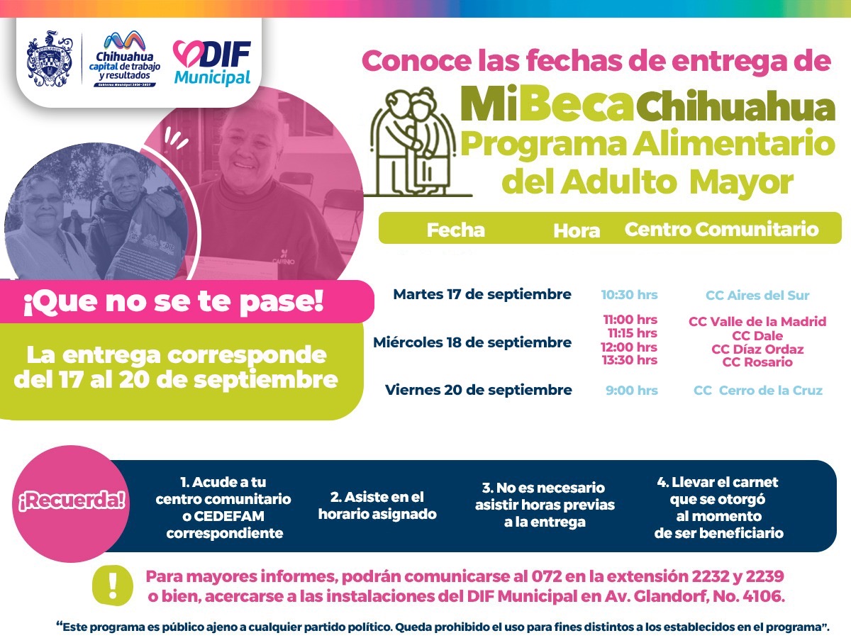Chihuahua, Chih., a 16 de septiembre de 2024.- El DIF Municipal de Chihuahua, informa los centros comunitarios a los que podrán acudir los solicitantes del Programa Alimentario del Adulto Mayor (PAAM) por su entrega del 17 al 20 de septiembre: 17 de septiembre: 18 de septiembre: 20 de septiembre: Las [...]