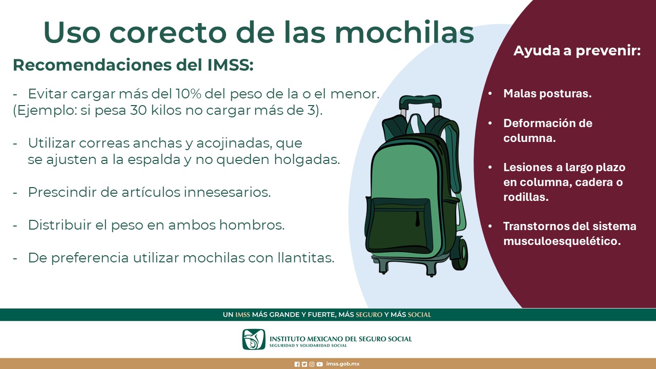 • Recomienda elegirlas y comprarlas a tiempo: las correas y el lomo deben de estar acojinadas.• La carga no debe sobrepasar el 10 por ciento del peso del menor. El Instituto Mexicano del Seguro Social (IMSS) en Chihuahua hace un exhorto a los padres de familia para que pongan cuidado [...]