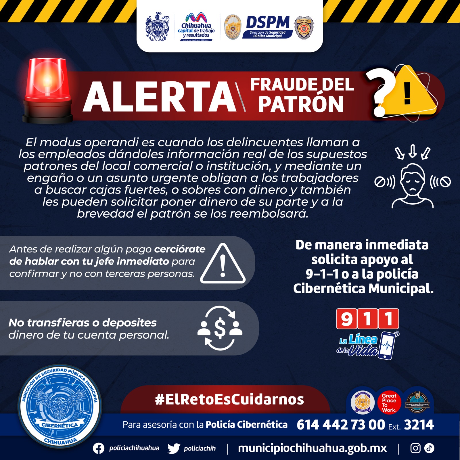 Chihuahua, Chih. A 10 de julio de 2024.- El Gobierno Municipal, emite recomendaciones para evitar caer en el “fraude del patrón”, un tipo de extorsión que se ha ido incrementando, mediante el cual internos de penales del estado de Jalisco realizan llamadas telefónicas para engañar a las y los chihuahuenses.