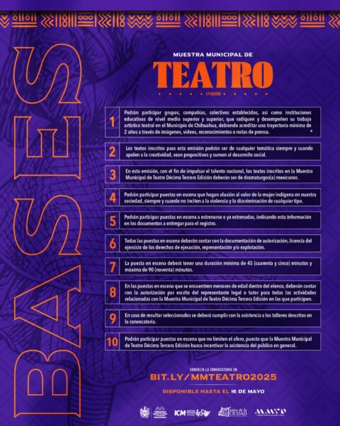 ***_Chihuahua, Chih. A 4 de abril del 2025_*.- El Gobierno Municipal, a través del Instituto de Cultura da a conocer los lineamientos para la presentación de proyectos en la XIII Edición de la Muestra Municipal de Teatro, un espacio que busca promover la creatividad escénica y el talento local a través de propuestas innovadoras y con impacto social.